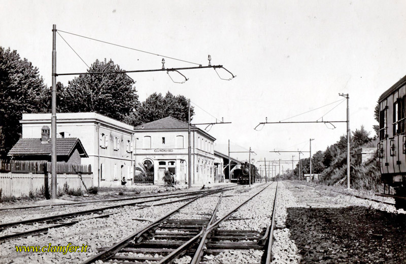 Foto d'epoca della elettrificata stazione di Gragnano con sul fondo una