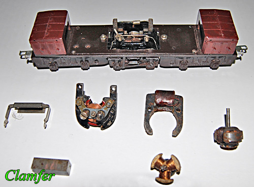 Ricordo - per inciso - che in quegli anni la precisione modellistica era molto approssimativa, anche se la Rivarossi, sovvertendo le tecniche dell’epoca, sperimentò le stampate in bachelite riuscendo a riprodurre particolari che precedentemente non potevano essere evidenziati. L’ansia di descrivere le sensazioni di gioia per aver acquisito un modello così particolare mi ha fatto allontanare, con voli pindarici, dal tema del restauro che era all’origine della presente dissertazione; passo quindi a descrivere le sequenze degli interventi. Come già specificato, questo modello ha i pantografi fissi in filo metallico rigido con gli striscianti sagomati a mo’ di banana, purtroppo uno di essi era rotto. Ho quindi trovato un filo di ferro acciaioso di pari diametro ed ho ricostruito l’archetto sagomandolo e saldandolo nella sua sede. Ho provveduto poi a ripulire con olio disossidante le basette dei pantografi liberandoli dalle infiorescenze di verderame formatasi negli anni. Con lo stesso metodo ho ripulito anche tutte le viti e le strutture interne in metallo dei carrelli porta-assi. Ho poi tremato al pensiero che i rotori del motore in mio possesso non potessero adattarsi a quella serie, ma con sommo gaudio uno dei tre era perfetto sia nell’asse che nell’ingranaggio per sostituire quello mancante. Ma, ahimè, l’ingranaggio di una ruota motrice girava a vuoto sull’asse! Mal di poco; tolto l’asse dal castello motore sono riuscito a risolvere il problema con una provvidenziale goccia di “cianoacrilico”. Restava da provare il funzionamento del motore: erano presenti le boccole portaspazzole ma mancavano sia le spazzole (quelle tipiche formate una da un cilindretto di rete di ottone arrotolata e l’altra in pasta di carbone), sia le mollette di spinta delle stesse. Rovistando nella mia scatola delle meraviglie, ove c’è di tutto, son saltate fuori due spazzole e due mollette. Le monto velocemente col cuore che batte a mille. Do corrente, ma nulla. Ho perso la sfida, penso, ma vedo sul banco di lavoro il flacone di riattivante per contatti elettrici; allora una spruzzata sul motore e sugli assi e di nuovo corrente: qualche singhiozzo, un sussulto, un po’ di fumo per l’olio che brucia sulle spazzole e finalmente via! Ora gira gagliardo come quando fu collaudato dal tecnico addetto della Rivarossi nello stabilimento di via Conciliazione 74, Como!