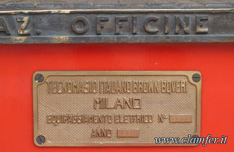 Targa del Tecnomasio Italiano Brown Boveri con indicazione dell'anno ed equipaggiamento elettrico e avvisi ai viaggiatori in metallo porcellanato (foto A. Bertagnin).