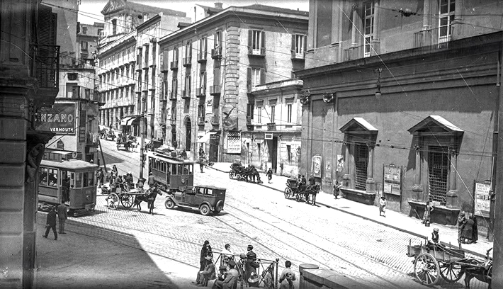 Incrocio Via S. Teresa-Via S. Rosa tra le due guerre: momento di vivace vita cittadina (da web). Così una bella mattina, dopo la medicazione che si svolse con relativa calma per la prospettiva di una passeggiata entusiasmante a sorpresa di un giro in tram, iniziò l’inusitata cura anestetica sui tram di Capodimonte. La mamma con il bimbo saliva a S. Teresa e poi fino al Tondo. Ritorno dall’altro lato fino a piazza Dante.