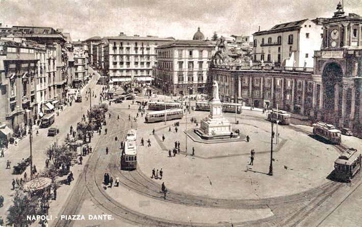 Grande giostra di tram a piazza Dante: linee del Nord e linee vesuviane (Collez. Fiorentino). L’idea funzionò alla grande in quanto il piccolo paziente, ma non di meno passeggero, si calmava già alla vista dell’infermiere. E poi non vedeva l’ora di scendere a Santa Teresa. Considerato il carattere estroverso dei napoletani, la vicenda del tram anestetico divenne notoria e familiare ai passeggeri abituali ed allo stesso personale, suscitando tenerezza e condivisione. Non poche volte il bigliettaio ammiccava con aria complice “Signo’ accomodatevi, lo fate dopo, il biglietto”.