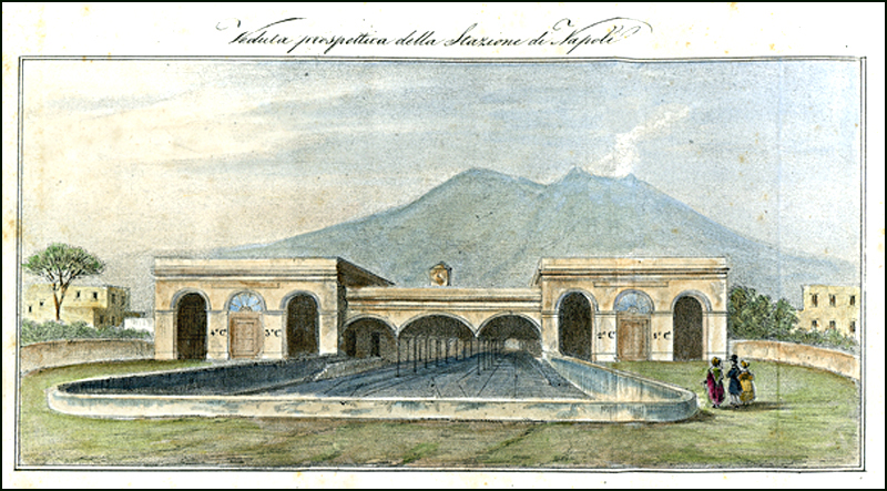 Incisione acquarellata che raffigura il prospetto della prima stazione di Napoli tratta dagli "Annali Civili del Regno delle Due Sicilie" del 1839. A costruzione completata, il prospetto sarà portato sulla Via dei Fossi (coll. A. Gamboni). La notizia della novità colse il Papa Gregorio XVI non solo poco preparato all’avvento di questa tecnologia, ma direi anche poco disposto ad accettarla ed a darle credito. Tant’è che assimilava con un discutibile gioco lessicale, le espressioni chemin de fer – chemin de l’enfer (via del ferro via dell’inferno). Più possibilista e progressista si dimostrò il suo successore Pio IX (Pontificato 1846-1878), il quale promosse uno studio per dotare il Regno del Vaticano (ossimoro intenzionale), di una rete ferroviaria. Ma, i suoi auspici s’infransero contro le drammatiche vicende dell’Unità d’Italia ed alla fine del potere temporale dei papi. Fece tuttavia “in tempo”, per così dire, ad intraprendere la realizzazione della Roma-Frascati nel 1856, poi la Roma Civitavecchia del 1859 (come supporto al traffico marittimo) e la Roma Ceprano di km 73 (1862). Ampia disamina delle ferrovie pontificie sui numeri 18-19-20 della collezione Clamferrovia. In questo fervore di progetti, pensò di dotarsi di un treno personale (detto papale) che è sopravvissuto alle complesse vicende storiche e può essere ancora oggi ammirato. Bell’articolo di A. Bertagnin a questo link: treno Papa Pio IX Giovanni Maria Mastai Ferretti.