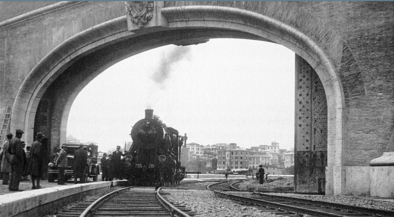 La prima locomotiva entra nel portone delle mura leonine (screen shot da Portale dei Treni) Di certo si può attribuire proprio alla stazione (diciamo FV) il capolavoro di quel raccordo tant’è che il Papa Pio XI, la definì con un poco di esagerazione, la più bella del mondo (arch. Giuseppe Momo).