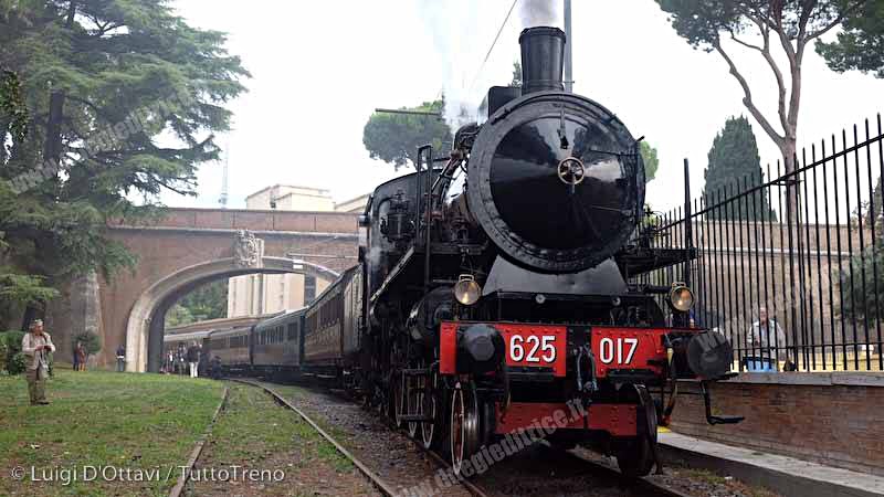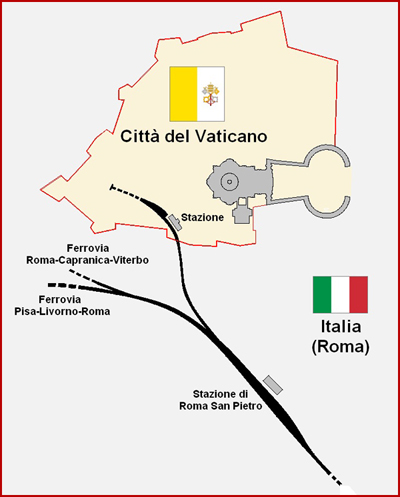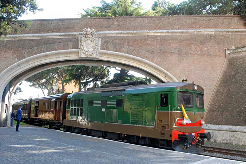 Convoglio di fondazione diretto a Castelgandolfo (Da Blog TT). Per concludere citerei i numerosi “treni dei bambini” in difficoltà, sia da Napoli che da Bari. Ed un’escursione degli amici dei treni (gruppo GATT Torino). Questi convogli sono entrati direttamente nello Stato pontificio. Cosa c’è da aspettarsi in un futuro prossimo circa sviluppi ed utilizzi? È un argomento questo non molto vivace, per dire la verità. Come detto, si registra una recente installazione di catenaria fino alle mura leonine. Ma come s’immagina, un convoglio da manovrare chiede comunque l’impiego di un loco a TD che necessariamente deve venire dall’Italia ed attendere il treno da introdurre. Per quanto riguarda il FV, esso, pur nella singolare originalità e bellezza, è stata destinato a finalità diverse, partendo dalla spietata osservazione di un utilizzo quasi azzerato dell’uso originario. Ospita un museo della filatelia e la sede dell’annona vaticana, una sorta di supermercato a prezzi fuori dogana. Insomma, a lato della struttura che ritengo possa ancora oggi prestarsi ad ammirazione estetica, due impieghi abbastanza banali che certo non gratificano l’estro dell’architetto Momo. Ho letto altresì che qualche notabile avrebbe immaginato i due binari di corsa, ridotti ad uno. E su quello sacrificato, poter edificare un sentiero pedonale per un accesso diretto e tutto sommato, agevole a San Pietro. Ciò dovrebbe avvenire con partenza dalla stazione RFI più prossima. Per quanto riguarda le modalità di gestione di questa pur ferrovia internazionale, forse gl’incartamenti che si sono inseguiti nel tempo, andrebbero a coprire ben più che l’itinerario. Al momento l’aspetto dal lato vaticano è delegato al Segretariato internazionale: così recita una delle delibere innovative generate dai lavori del Concilio Vaticano II. Parliamo del 1969, insomma non proprio ieri e neanche ieri l’altro. Qui finisce il nostro raccontino. Devo pur dire che la sua elaborazione ha richiesto piccole ricerche, come sempre gratificanti ed intriganti. Un interesse che è stato esaltato proprio dalla singolarità di questo percorso, breve ma punteggiato da note originali di storia e di costume.
