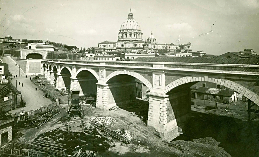 Immagine d’epoca del massiccio manufatto del ponte ferroviario sul vallone Gelsomino (Da internet). La larghezza di m. 9,50 include due binari a cui nelle operazioni ne è usato solo uno. Arriviamo alle mura leonine (848-852) che segnano il confine. Il portone di accesso pesa ben 35,5 tonnellate.