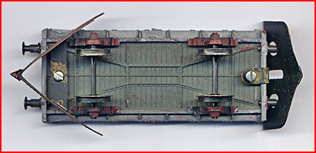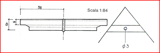 Foto del carro originale usato per la trasformazione (da Rivarossi Memory). Per la costruzione del vomere ho adoperato una lastrina di ottone da 3/10 dalla quale, con archetto da traforo, ho ricavato il rostro riprodotto nel disegno. Per ottenere le chiodature, dopo aver poggiato le citate lastrine su un blocchetto di legno duro, con uno spillo di acciaio e con misurati colpi di martello si otterranno delle chiodature molto realistiche. Quindi, con una pinza a becchi piatti si piega la strisciolina di ottone sagomata come in figura.